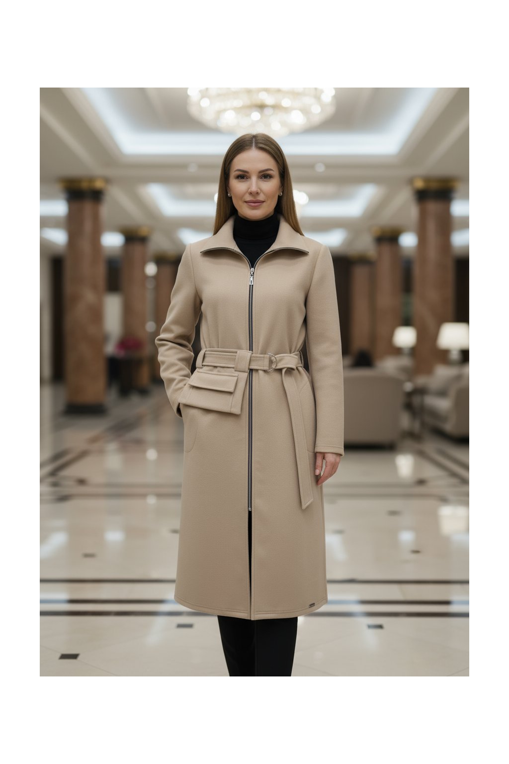 - Délka kabátu: pod kolena – ideální pro chladnější dny, kdy chcete zůstat v teple a zároveň působit žensky.