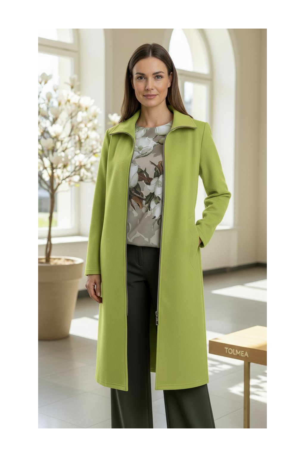 - Délka kabátu: pod kolena – ideální pro chladnější dny, kdy chcete zůstat v teple a zároveň působit žensky.