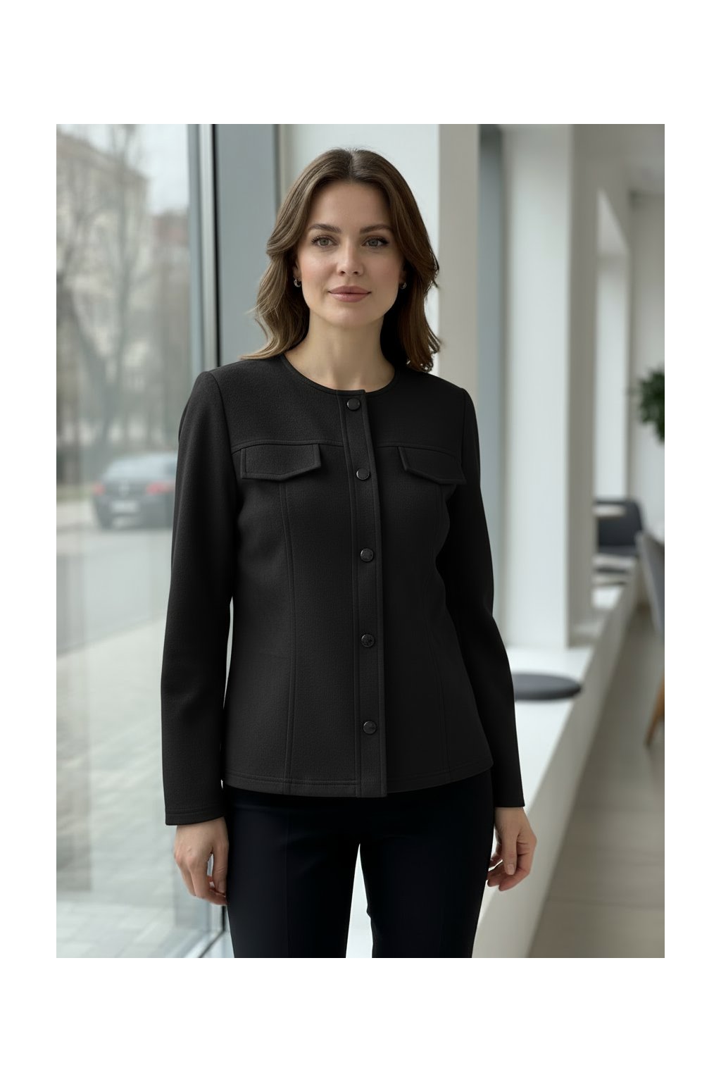 - Designové prvky: kulatý výstřih bez límce, knoflíkové zapínání po celé délce, dekorativní klopy na prsou a jemné prošití pro vytvarování siluety.