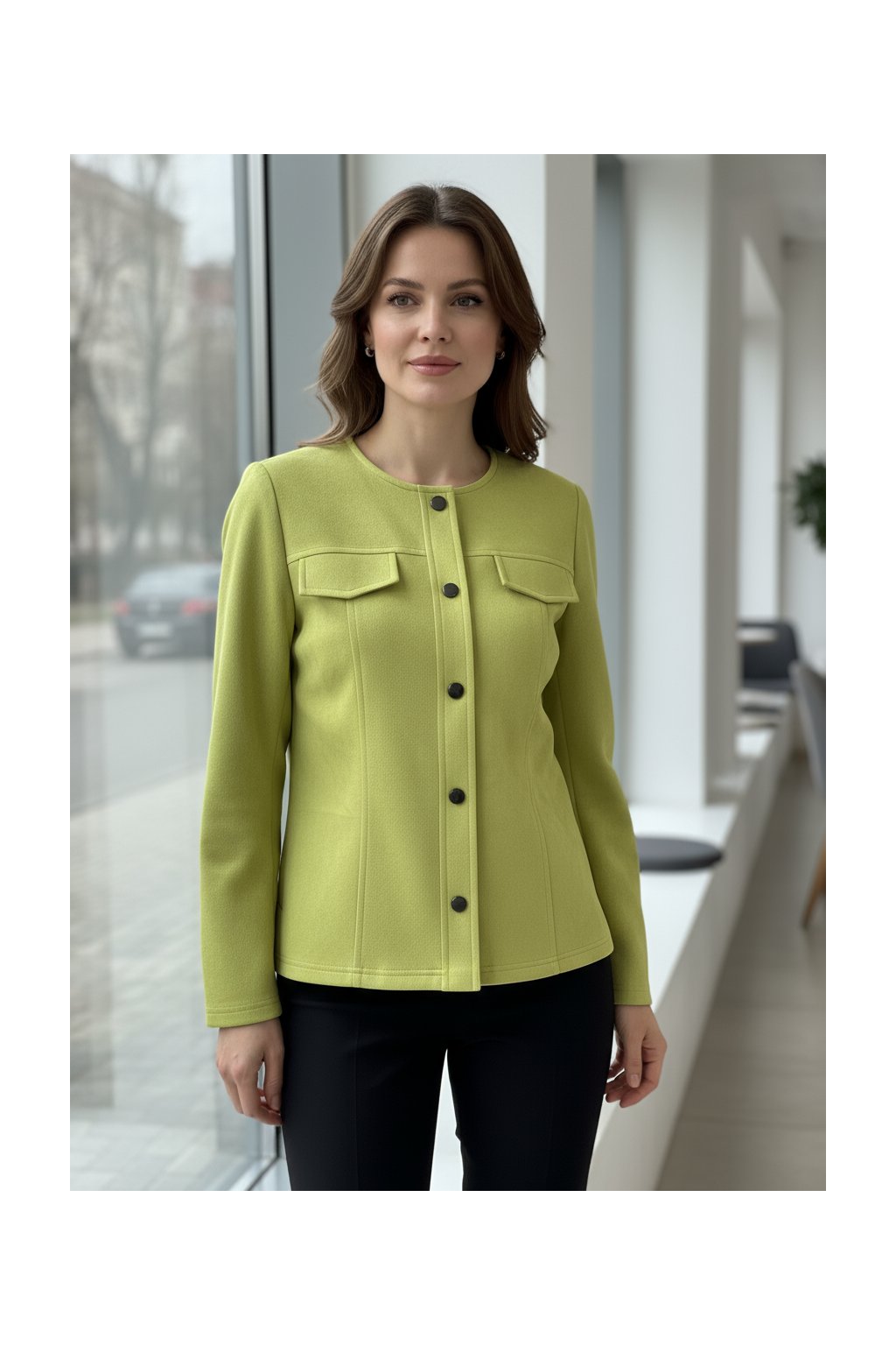 - Designové prvky: kulatý výstřih bez límce, knoflíkové zapínání po celé délce, dekorativní klopy na prsou a jemné prošití pro vytvarování siluety.