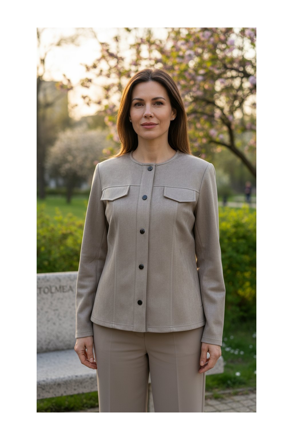 Bundička Siena je stylovým spojením elegance a pohodlí. Měkký semišový materiál působí luxusně, zatímco jednoduchý střih s jemnými detaily dodává outfitu moderní šmrnc. Ideální jako lehká bunda k šatům i kalhotám – univerzální kousek, který unosíte po celý rok.