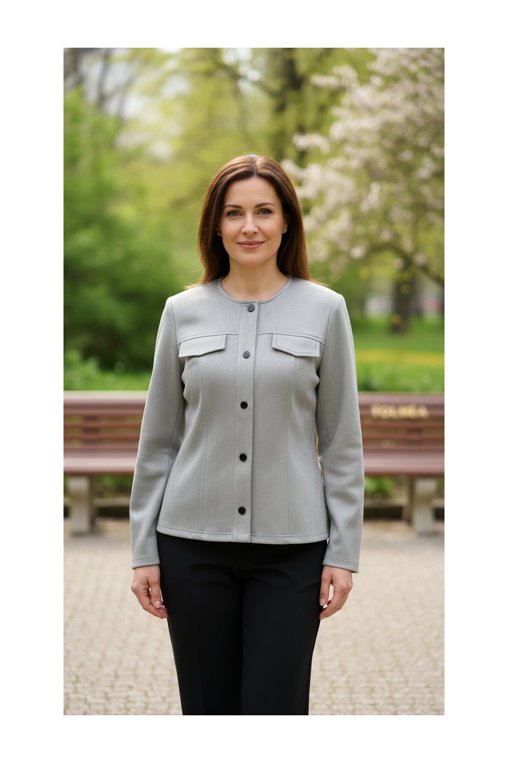 - Designové prvky: kulatý výstřih bez límce, knoflíkové zapínání po celé délce, dekorativní klopy na prsou a jemné prošití pro vytvarování siluety.