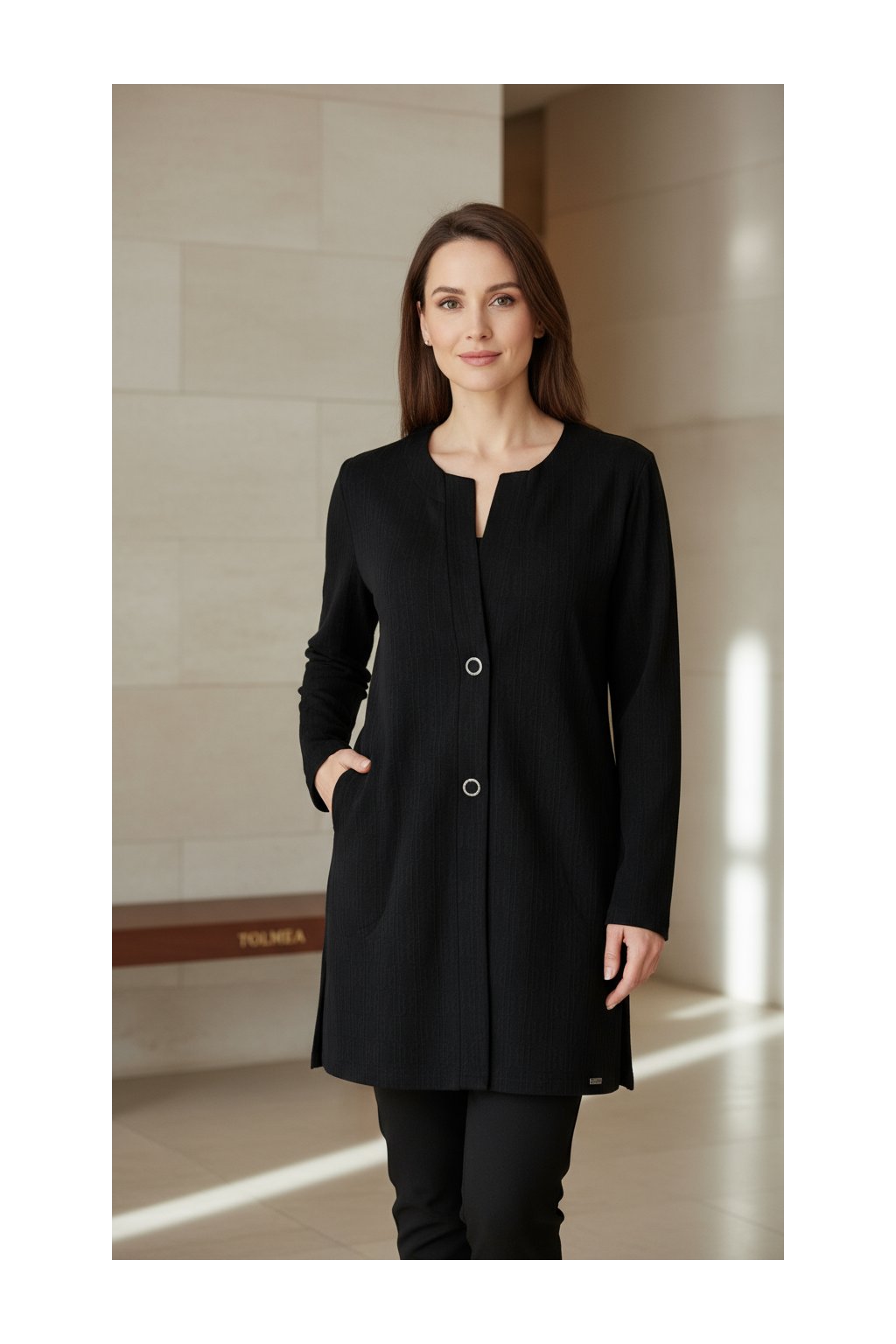 - Designové prvky: kulatý výstřih, zapínání na dva výrazné knoflíky, praktické přední kapsy a elegantní plastický vzor po celé ploše.