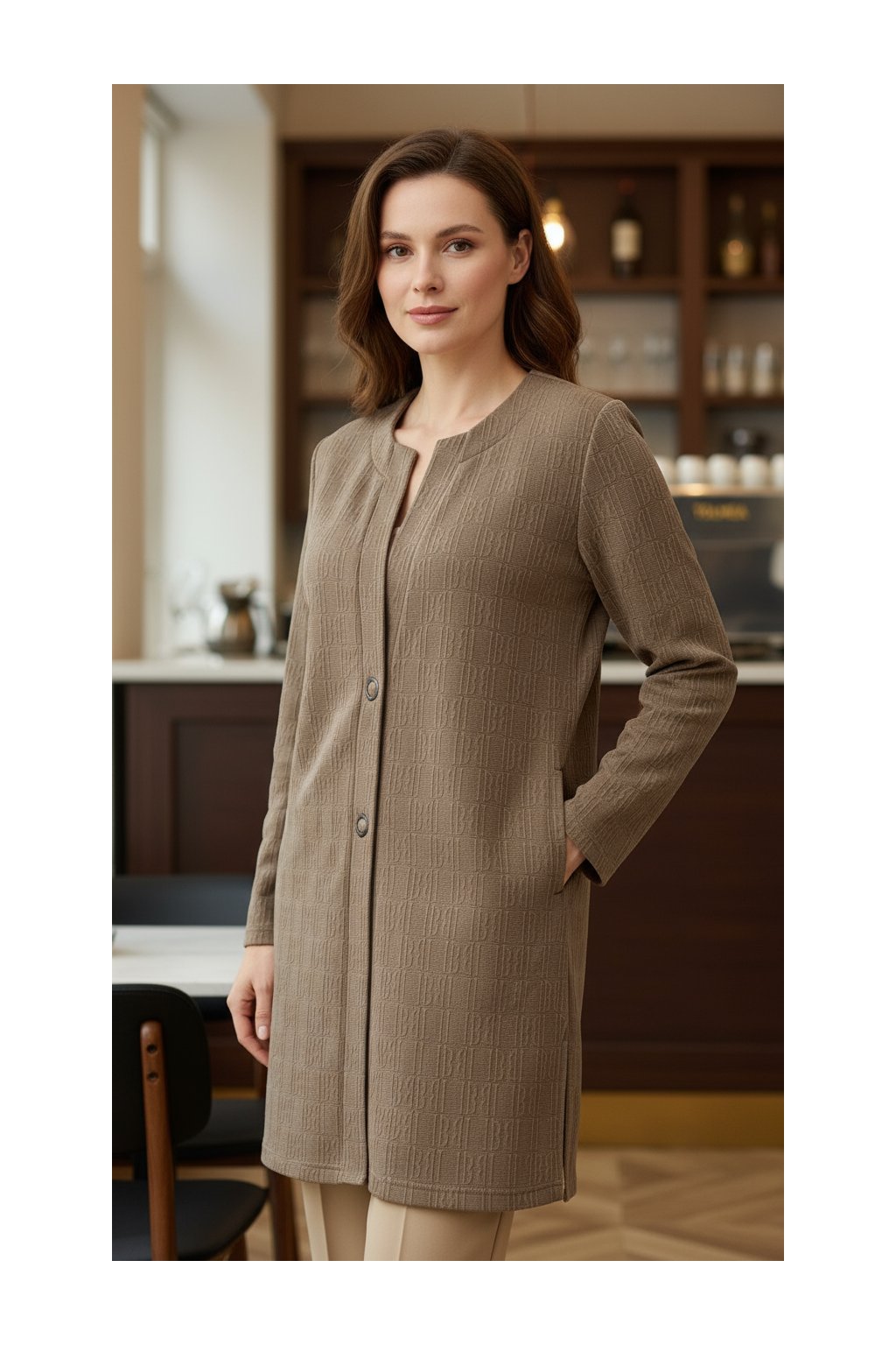 - Designové prvky: kulatý výstřih, zapínání na dva výrazné knoflíky, praktické přední kapsy a elegantní plastický vzor po celé ploše.