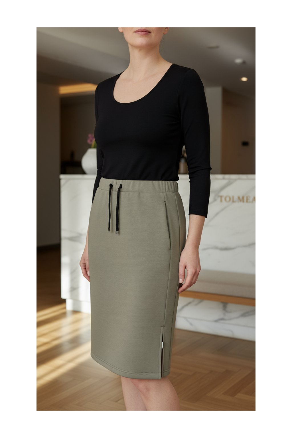 Sukně Magda je symbolem pohodlí a ženské elegance v moderním pojetí. Její hladká silueta lichotí postavě, zatímco pružný pas se šňůrkou zaručuje komfort při každém pohybu. Ideální volba pro ženy, které hledají elegantní kousek s ležérním dotekem.