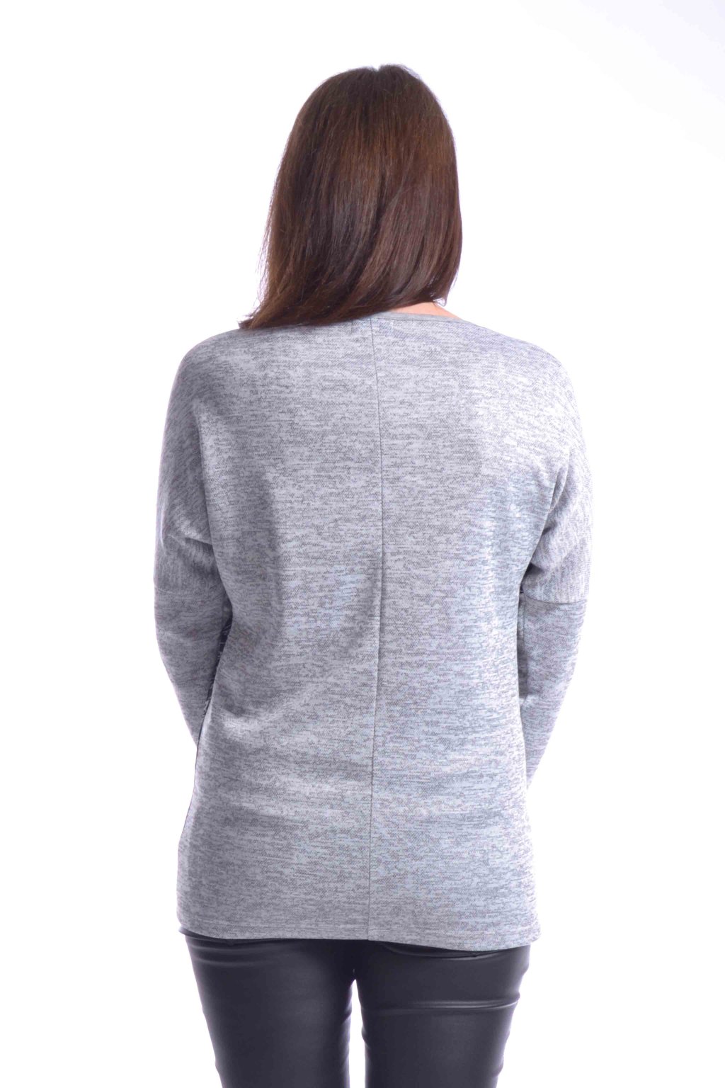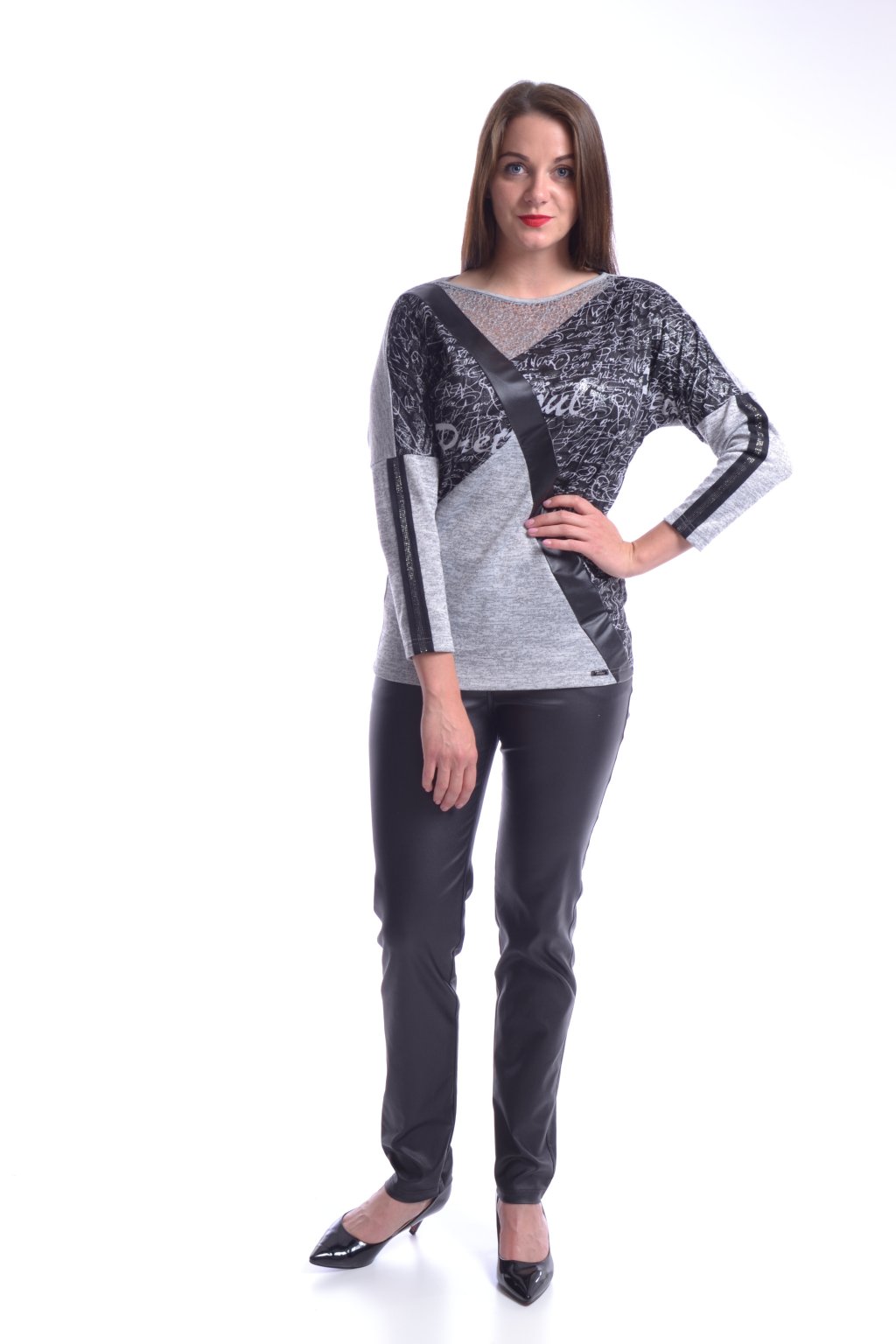 Kimono je z příjemného úpletového materiálu. Využitím asymetrického členění předního dílu, vyniká zajímavá kombinace různých materiálů. Ozdobným detailem rukávů je našitá kamínková stužka.