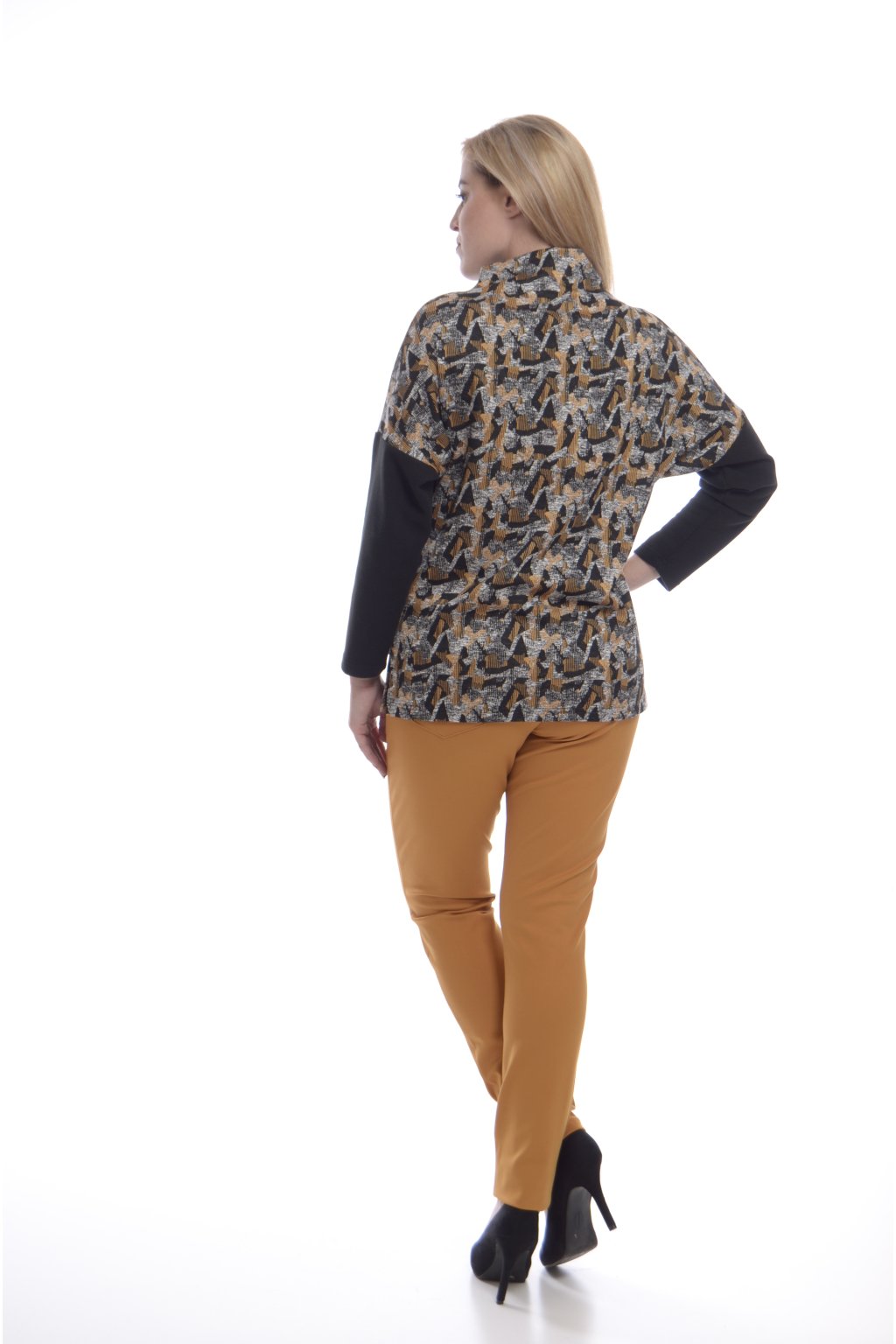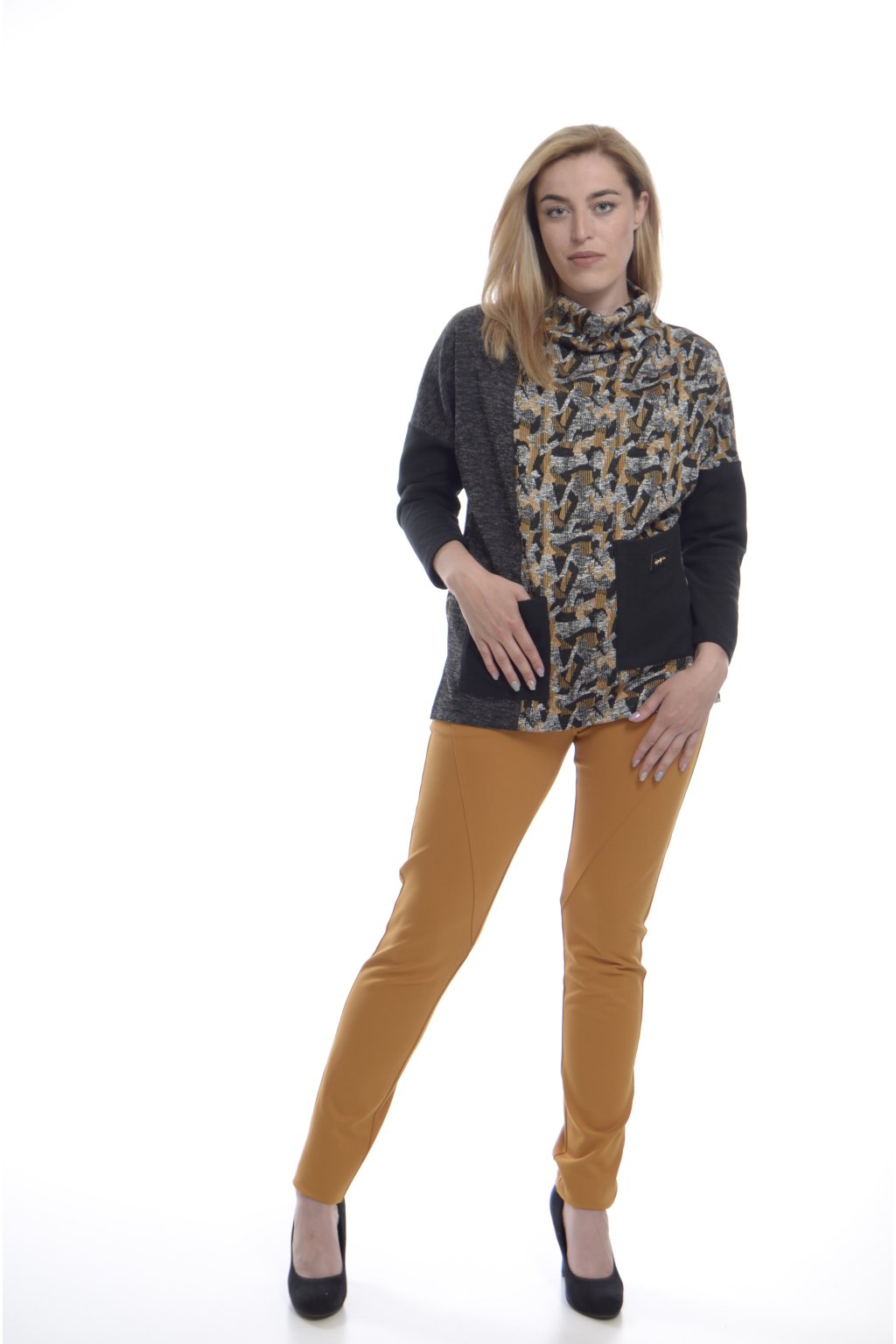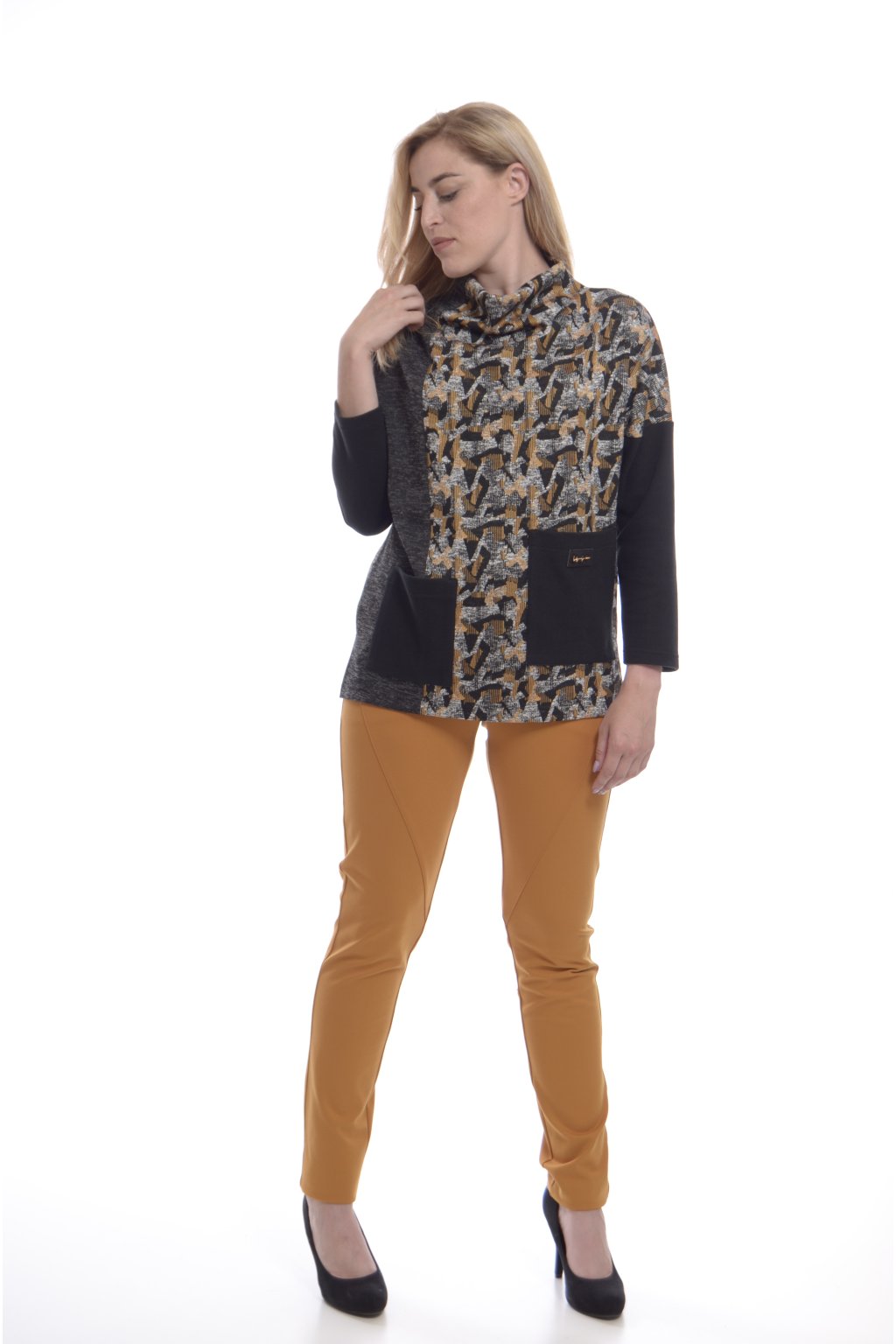 Další komponenty jako jsou atypicky umístěné kapsy nebo stojáček u krku dělají halenku unikátní a odlišují ji od běžných módních kousků.