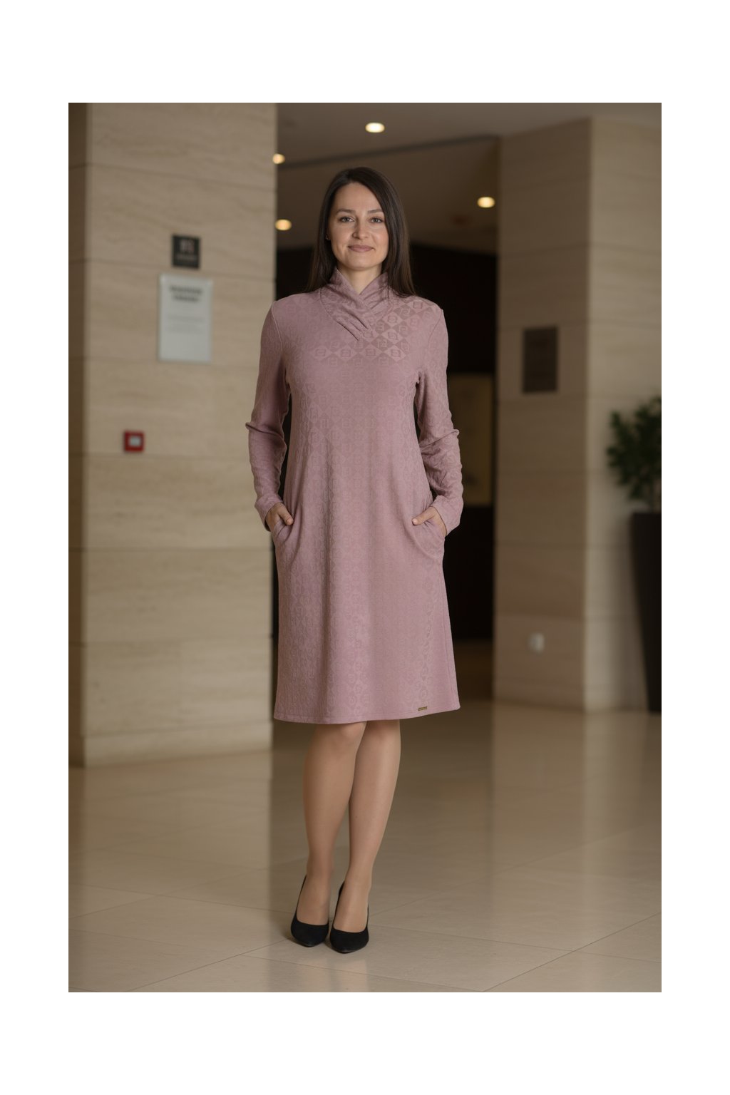 Styl, který se nosí s lehkostí – šaty Filipa jsou pohodlné, lichotivé a plné jemné elegance. Plastický vzor v úpletu dodává modelu strukturu a originalitu, zatímco rafinovaný stojáček krásně rámuje dekolt.