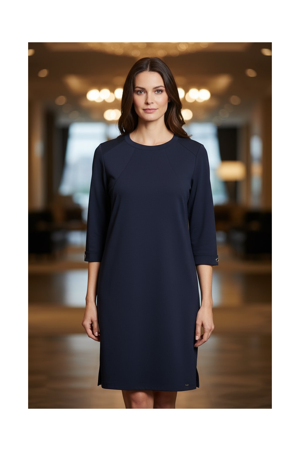 - Vsazené rukávy s 3/4 délkou zakončené manžetou s ozdobným knoflíkem