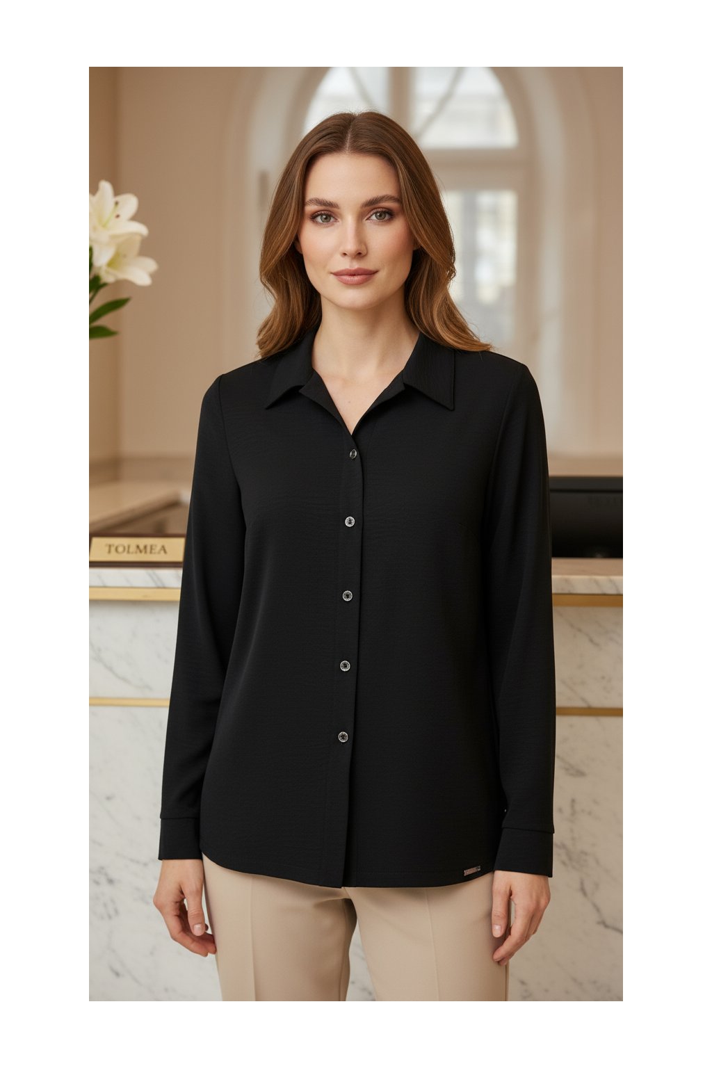 - Designové prvky: klasický košilový límec, celopropínací zapínání na knoflíky, dlouhý rukáv s manžetou a jemně zvlněná struktura látky, která dodává zajímavý efekt.