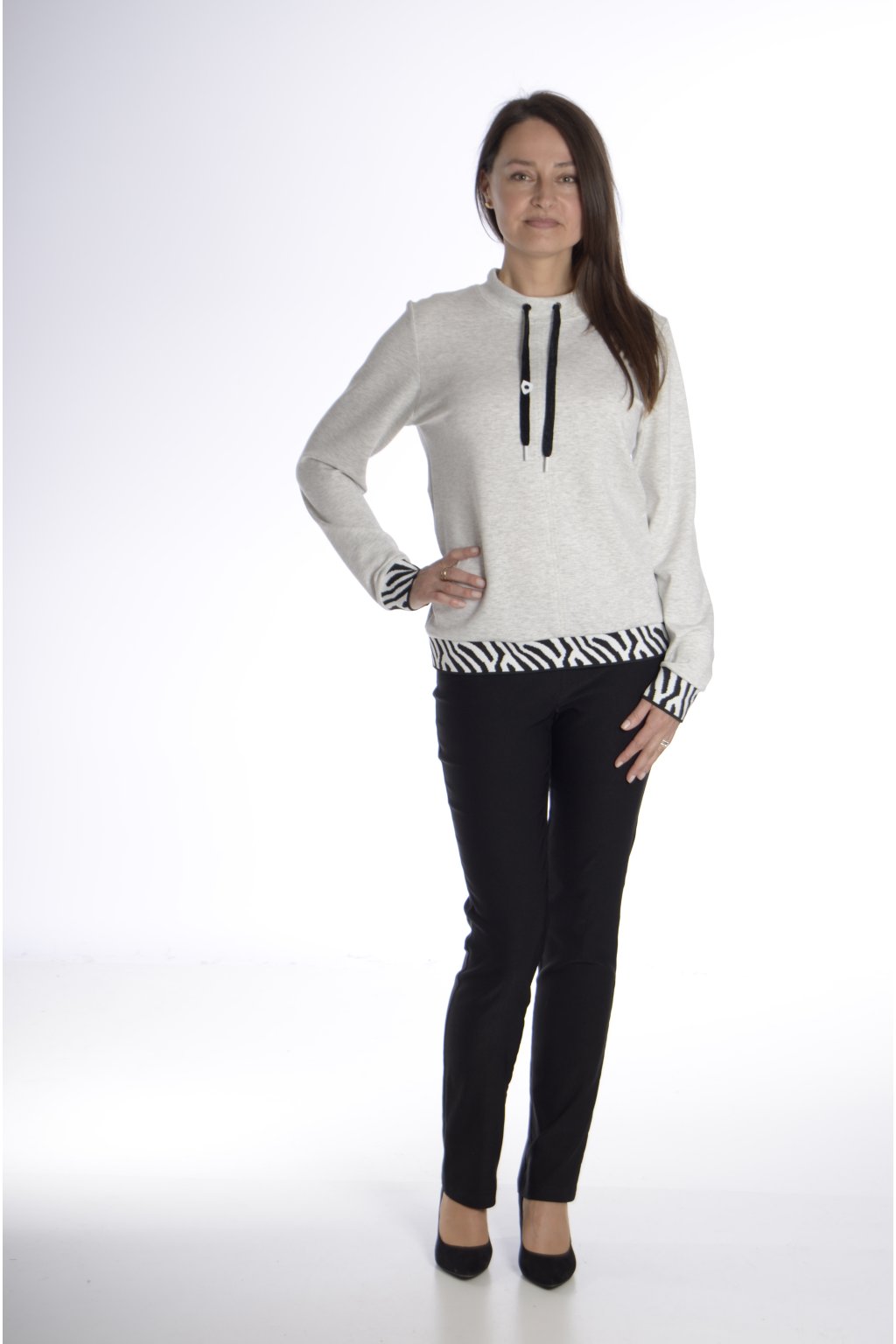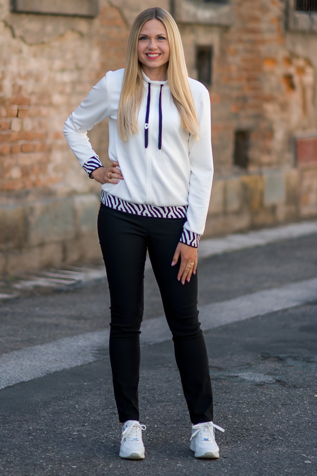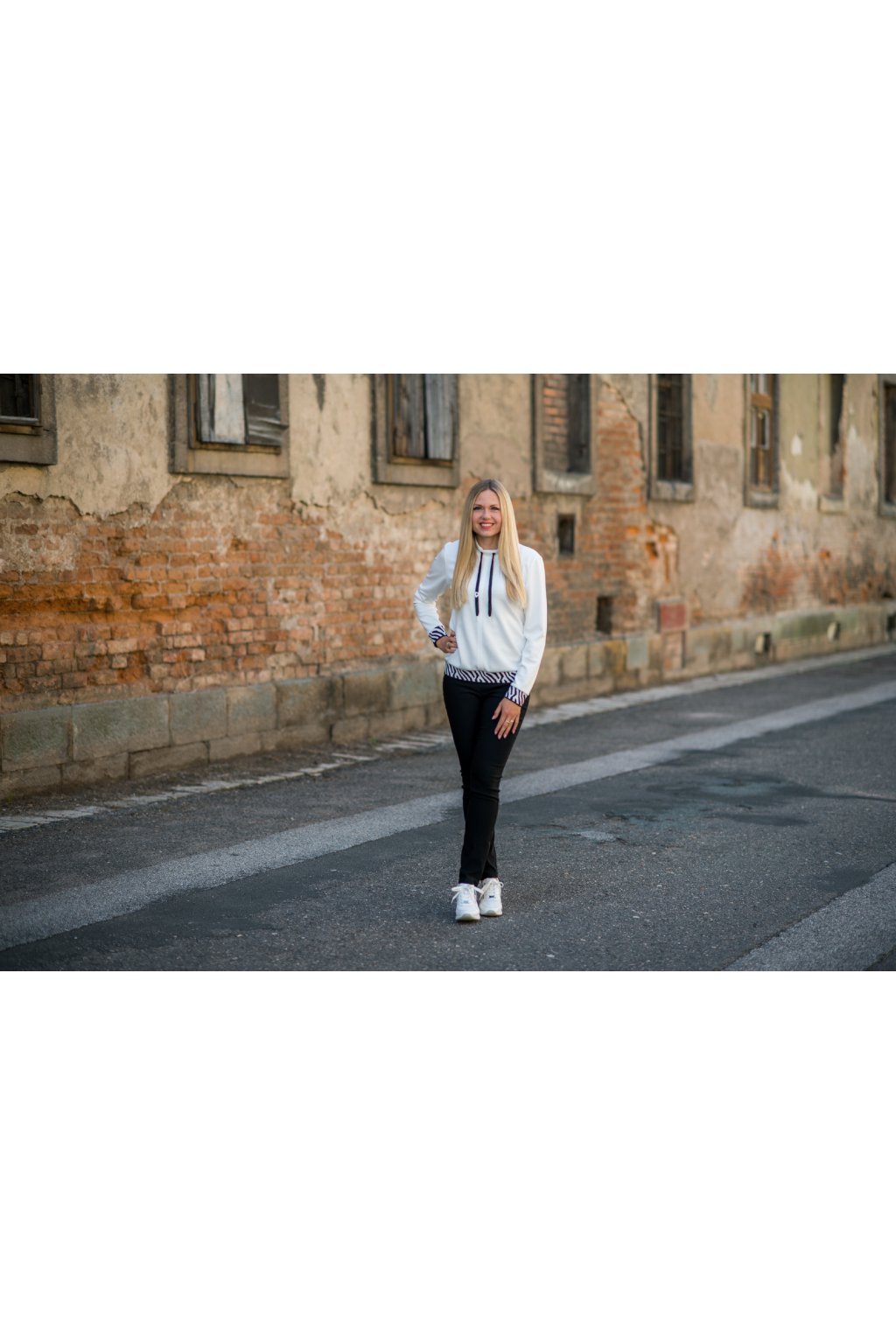 Kontrastní lemování s motivem zebry na rukávech a spodním lemu, dekorativní černá šňůrka u výstřihu a jemně stojáčkový límec – originální detaily, které mikinu odlišují od ostatních. - Využití:
