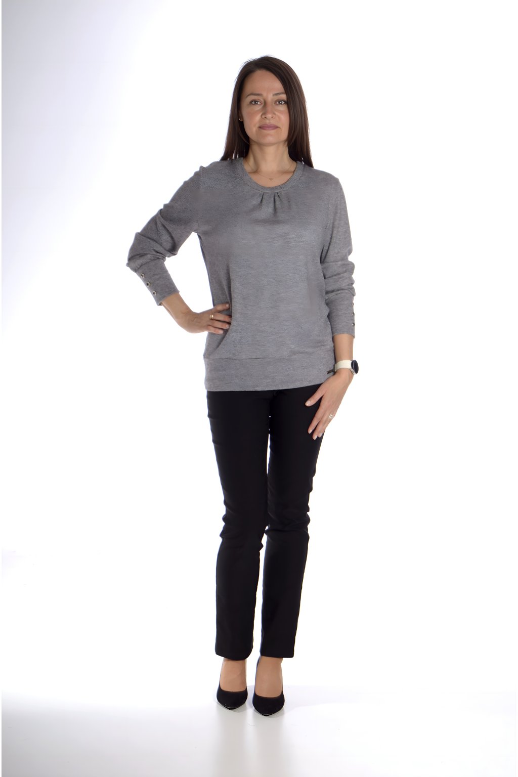 Kulatý výstřih s jemným nařasením, ozdobné knoflíky na rukávech a prodloužený spodní lem, který lichotí postavě a zároveň působí elegantně. - Využití:
