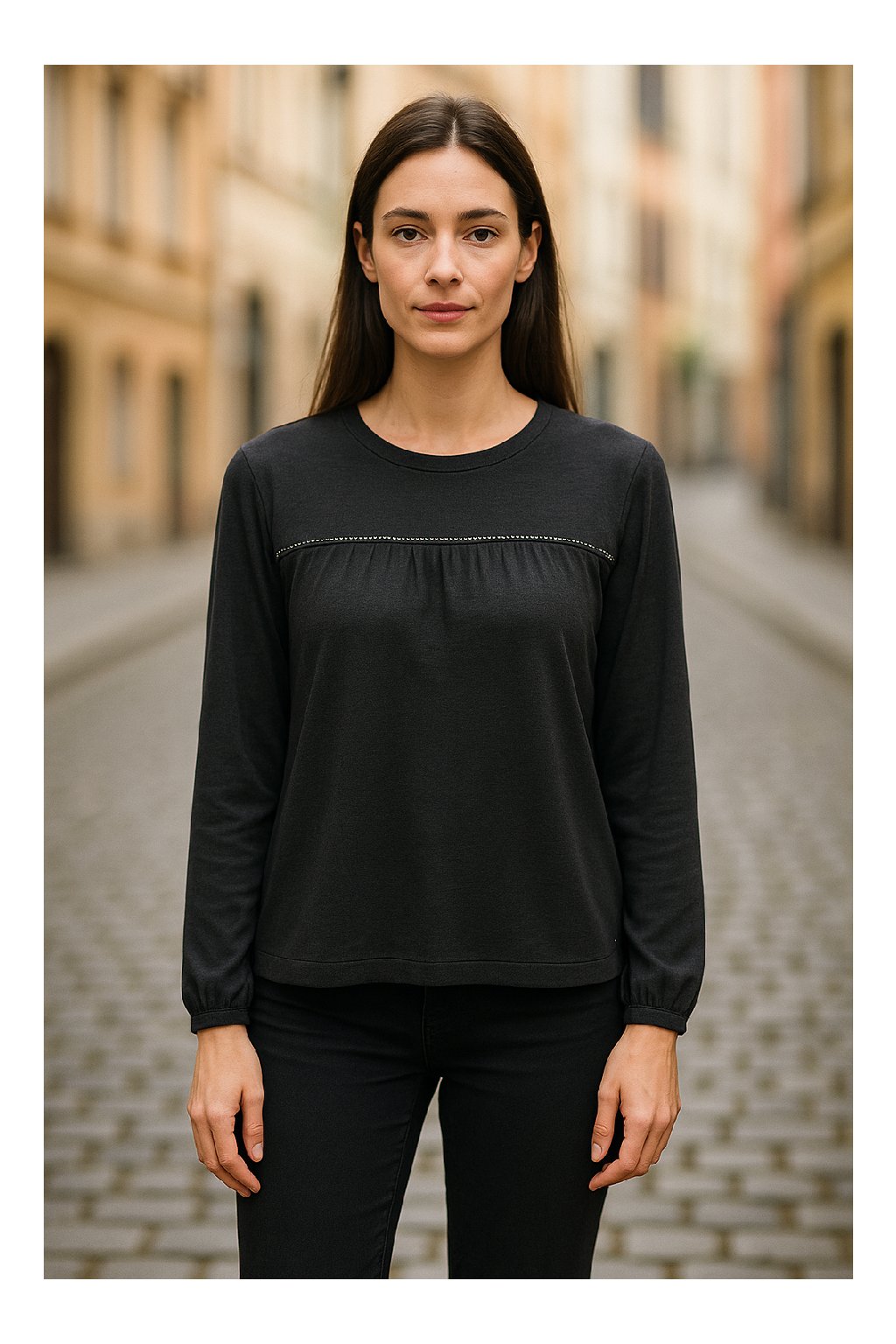 Jemné řasení na hrudi, které lichotí postavě, a dekorativní pás s drobnými kamínky, který dodává halenku ženský a elegantní nádech. Klasický kulatý výstřih a dlouhé rukávy dotvářejí čistý vzhled. - Využití: