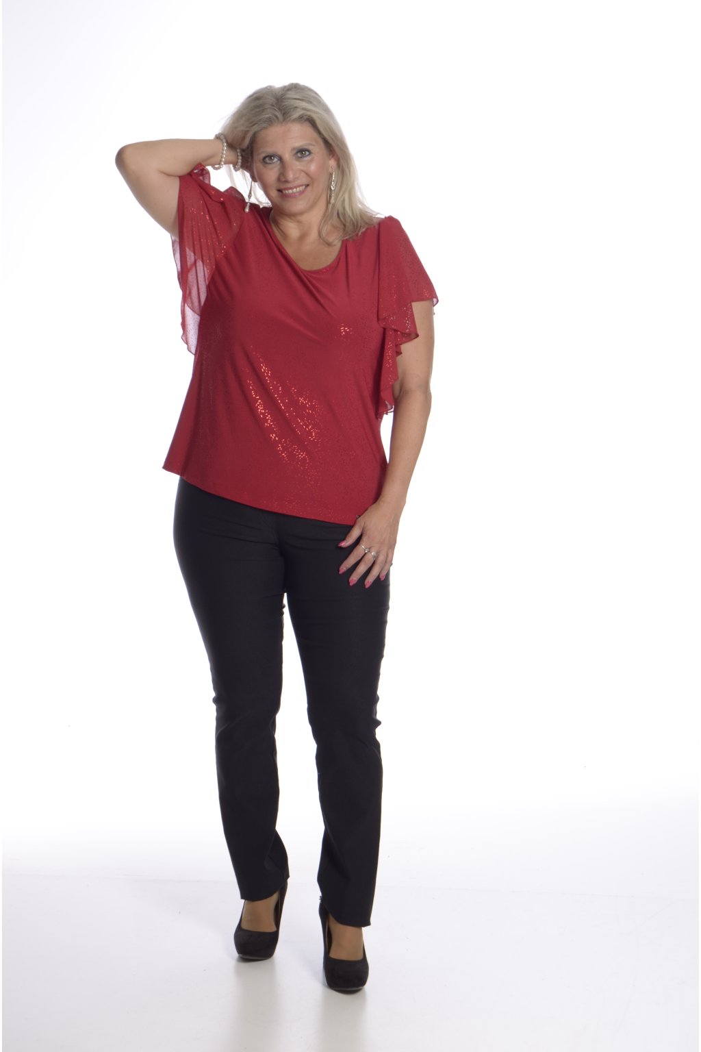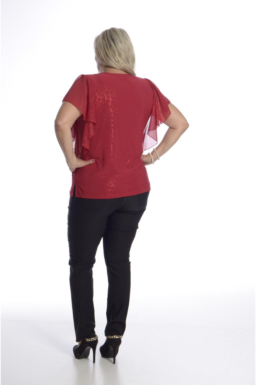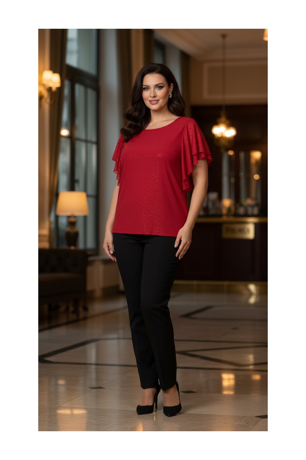 Stylová halenka s volánovými rukávy a jemným leskem, která zaujme na první pohled. Pohodlný střih a působivý design tvoří ideální kombinaci pro slavnostní i večerní příležitosti.