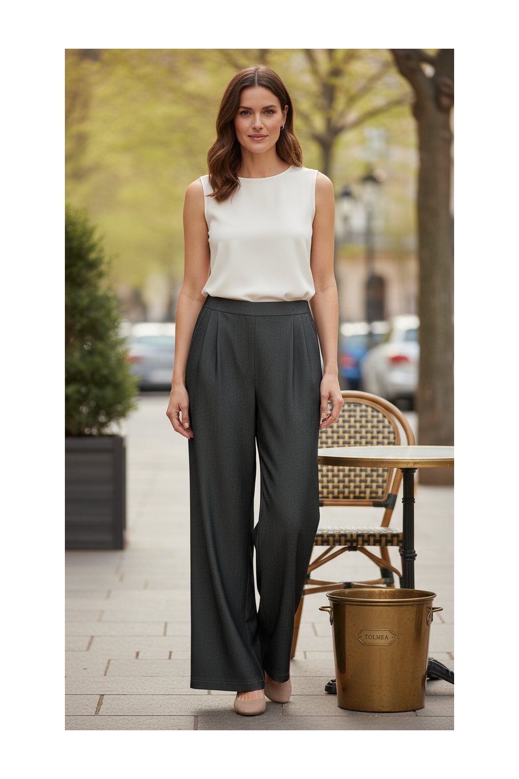 - Designové prvky: hladký pas, jemné sklady v přední části pro pohodlné padnutí, rovné široké nohavice, které opticky prodlužují nohy, a praktické boční kapsy.