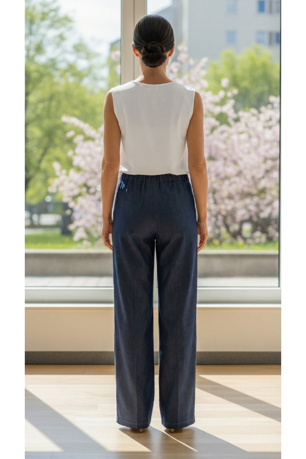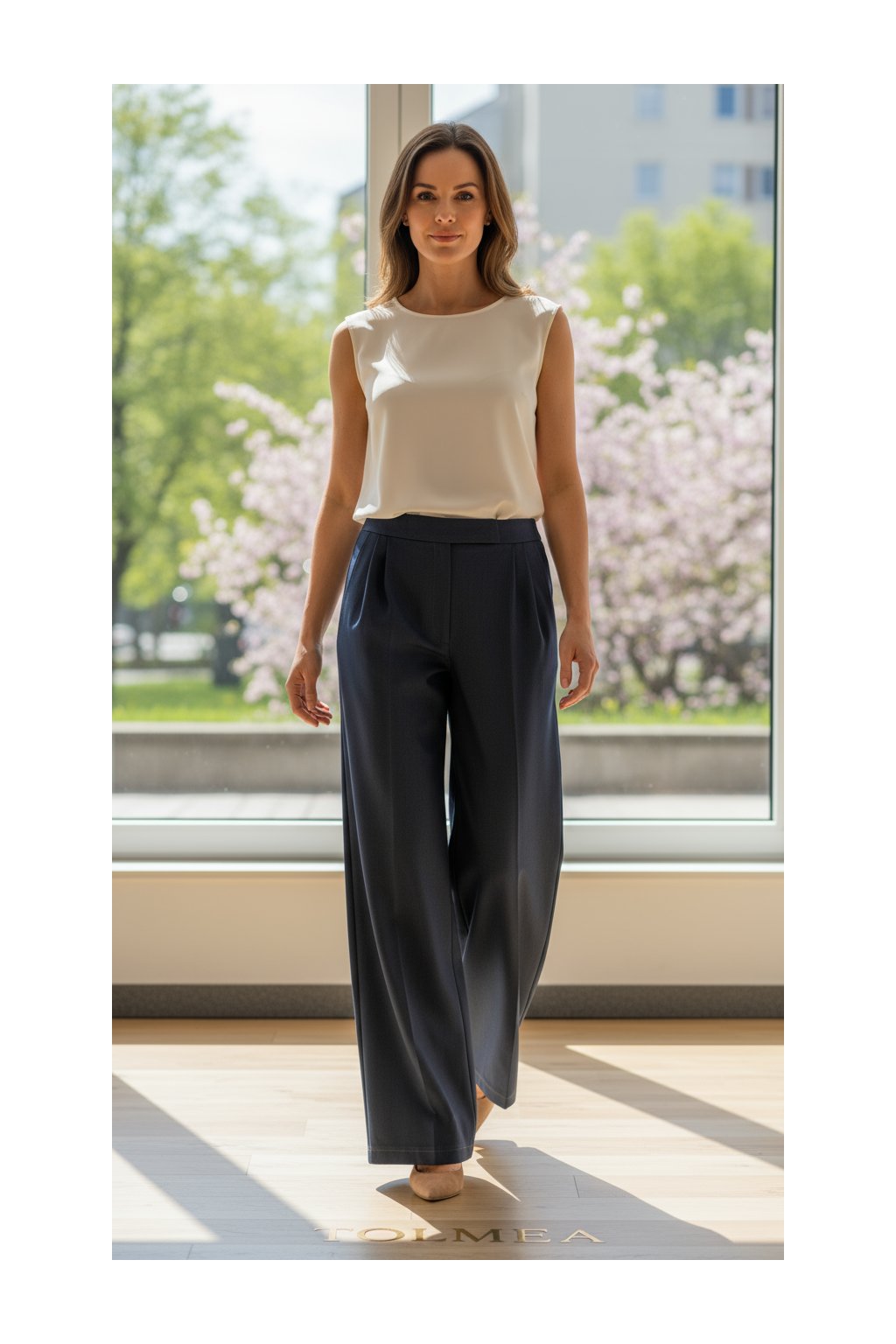 • Designové prvky: hladký pas, jemné sklady v přední části pro pohodlné padnutí, rovné široké nohavice, které opticky prodlužují nohy, a praktické boční kapsy.