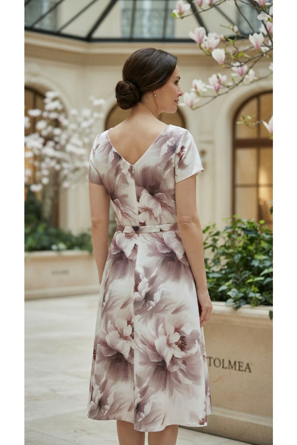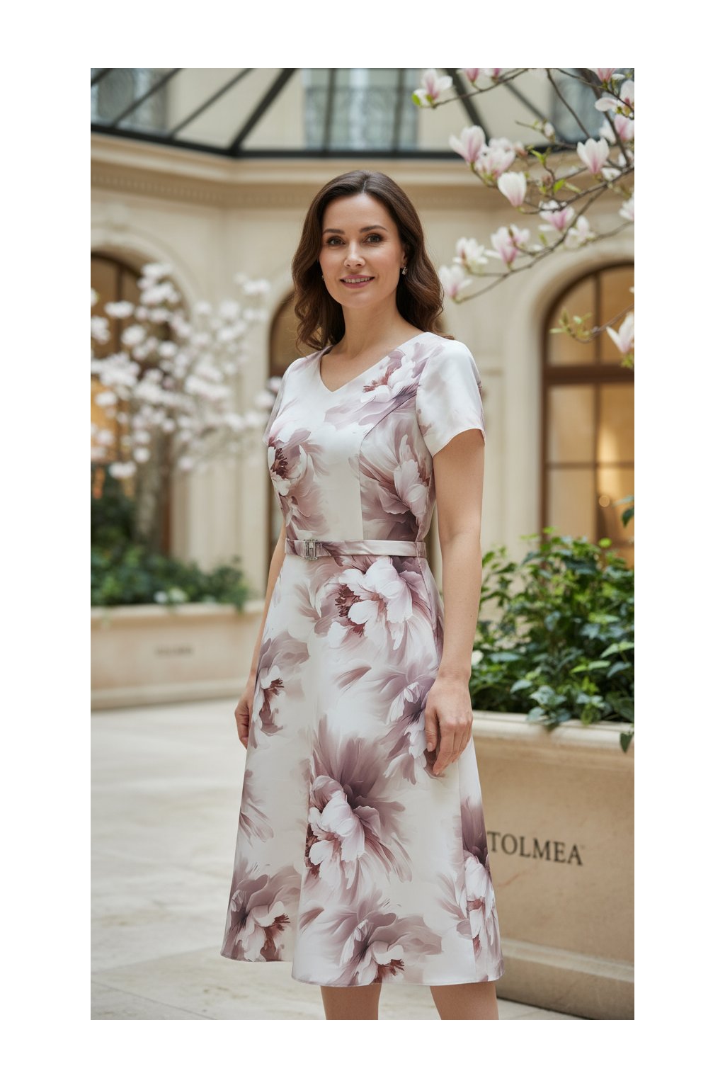 - Střih: projmutý živůtek, výstřih do V, krátké rukávy a áčková sukně ke kolenům.