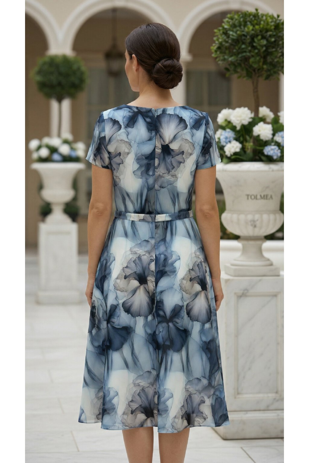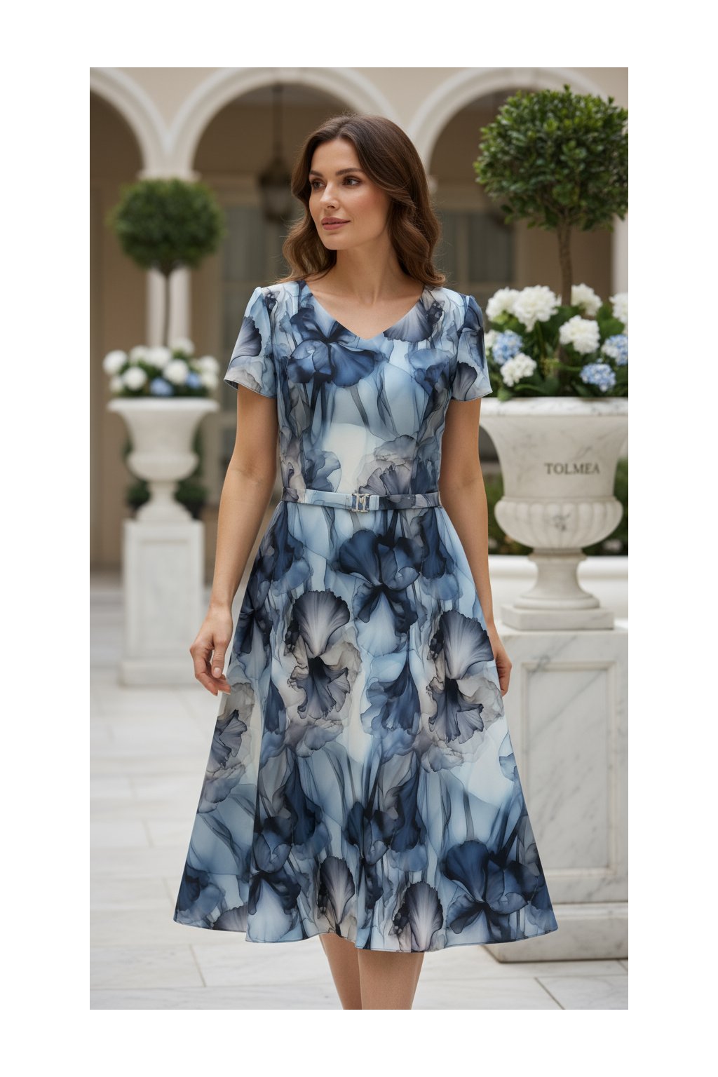 - Střih: projmutý živůtek, výstřih do V, krátké rukávy a áčková sukně ke kolenům.