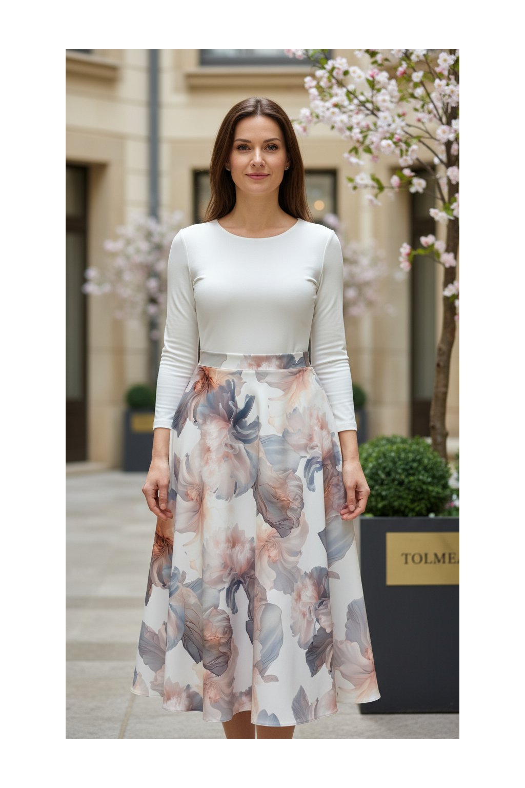 Sukně Dafné je elegantní a splývavá sukně s jemným květinovým vzorem. Áčkový střih lichotí postavě a dodává outfitu lehkost a ženskost.