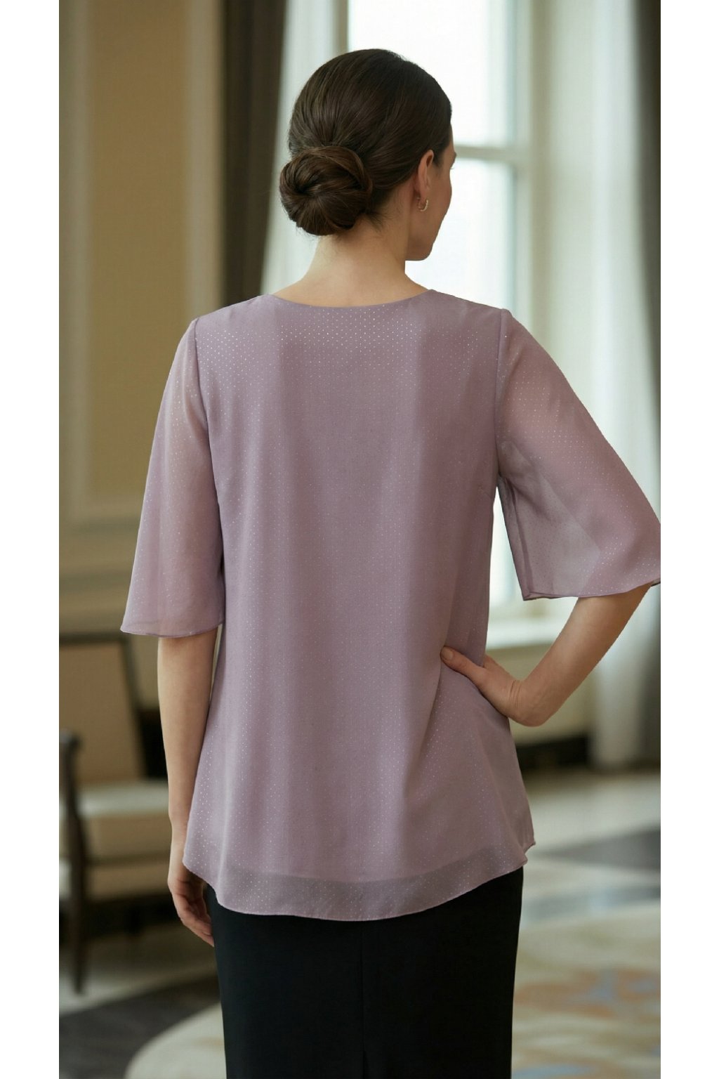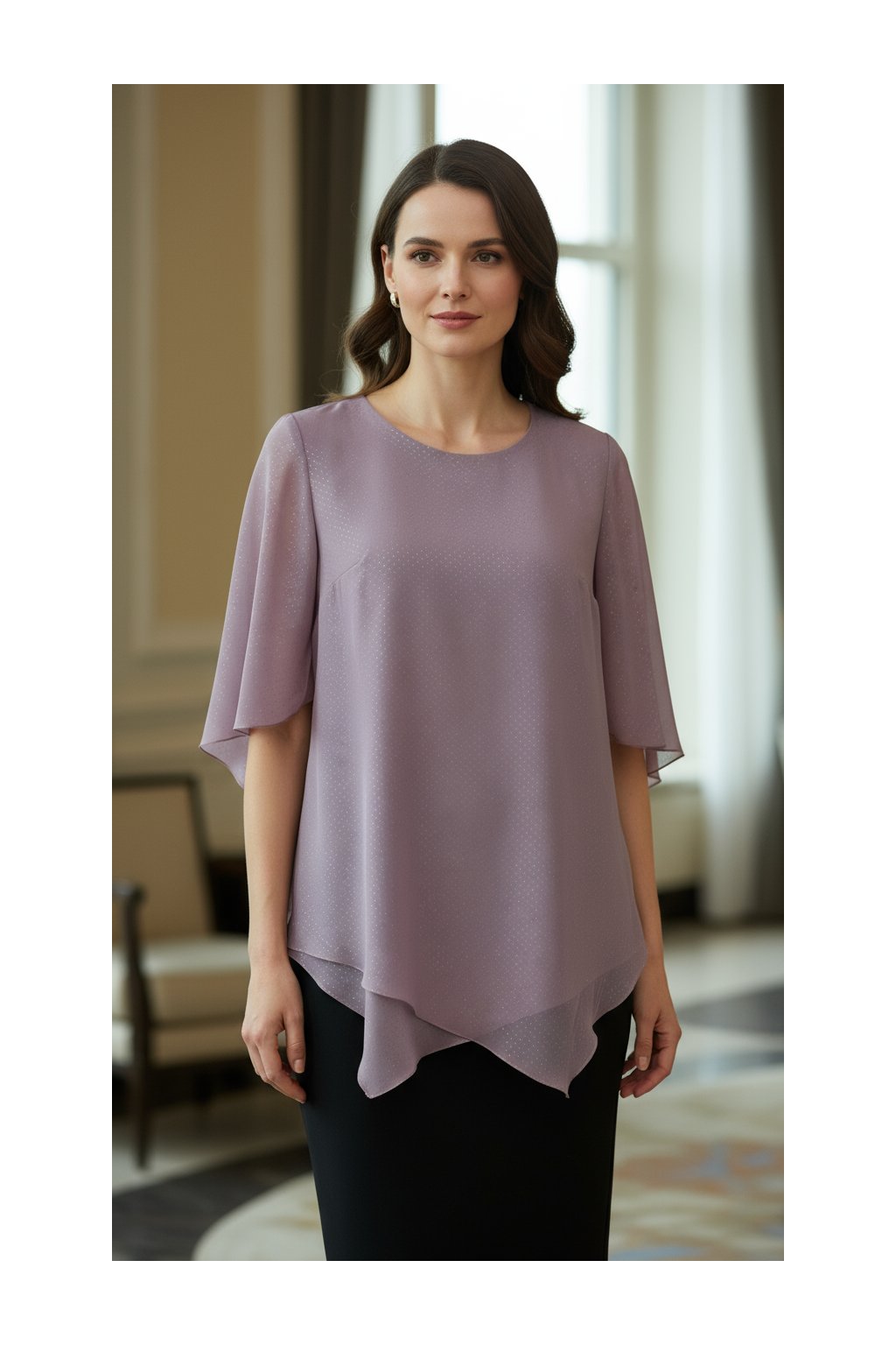 - Rukávy: lehké, splývavé s elegantním zakončením.