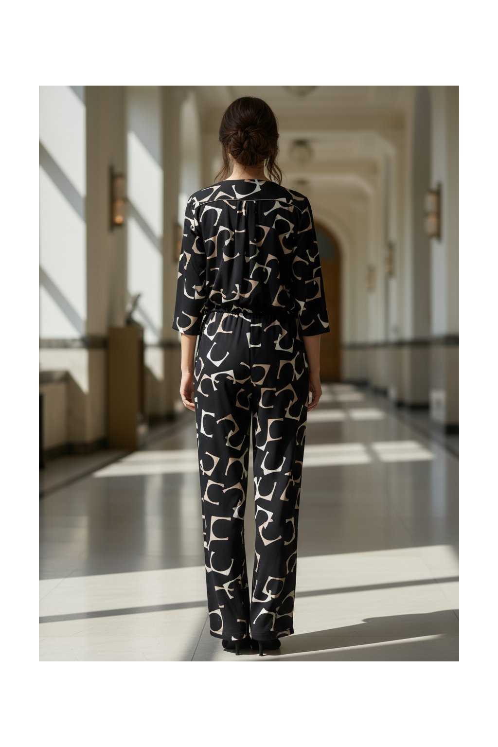 - Designové prvky: výstřih do „V“ s knoflíčky, 3/4 rukávy, pásek v pase na zavázání pro zvýraznění siluety, rovné nohavice s lehkým spadem.