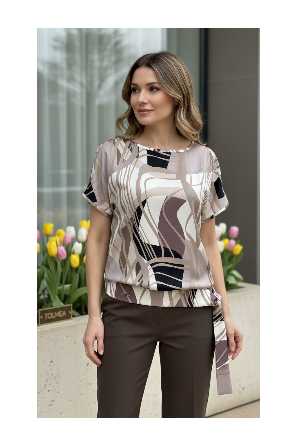 - Vzor: moderní geometrický nebo jemně puntíkovaný design v neutrálních odstínech, které se snadno kombinují s jednobarevnými kalhotami či sukní.
