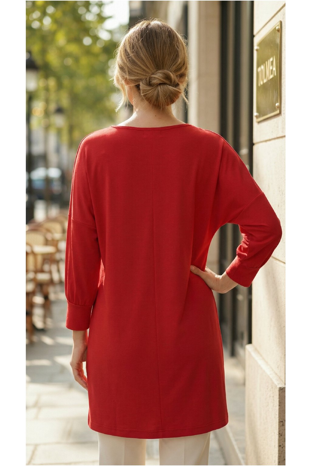 Tunika Martine je stylový a pohodlný kousek, který spojuje elegantní střih s ležérními detaily. Jemný, pružný materiál s hladkým povrchem zaručuje komfort při nošení a zároveň udržuje upravený vzhled po celý den. Šňůrky s kovovými zakončeními u výstřihu a volnější rukávy s řasením dodávají tunice moderní nádech.