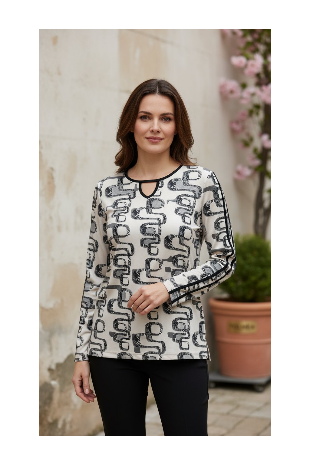 Halenka Colette s moderním abstraktním vzorem a dekorativním výstřihem je pohodlným a elegantním kouskem pro každodenní i společenské nošení.