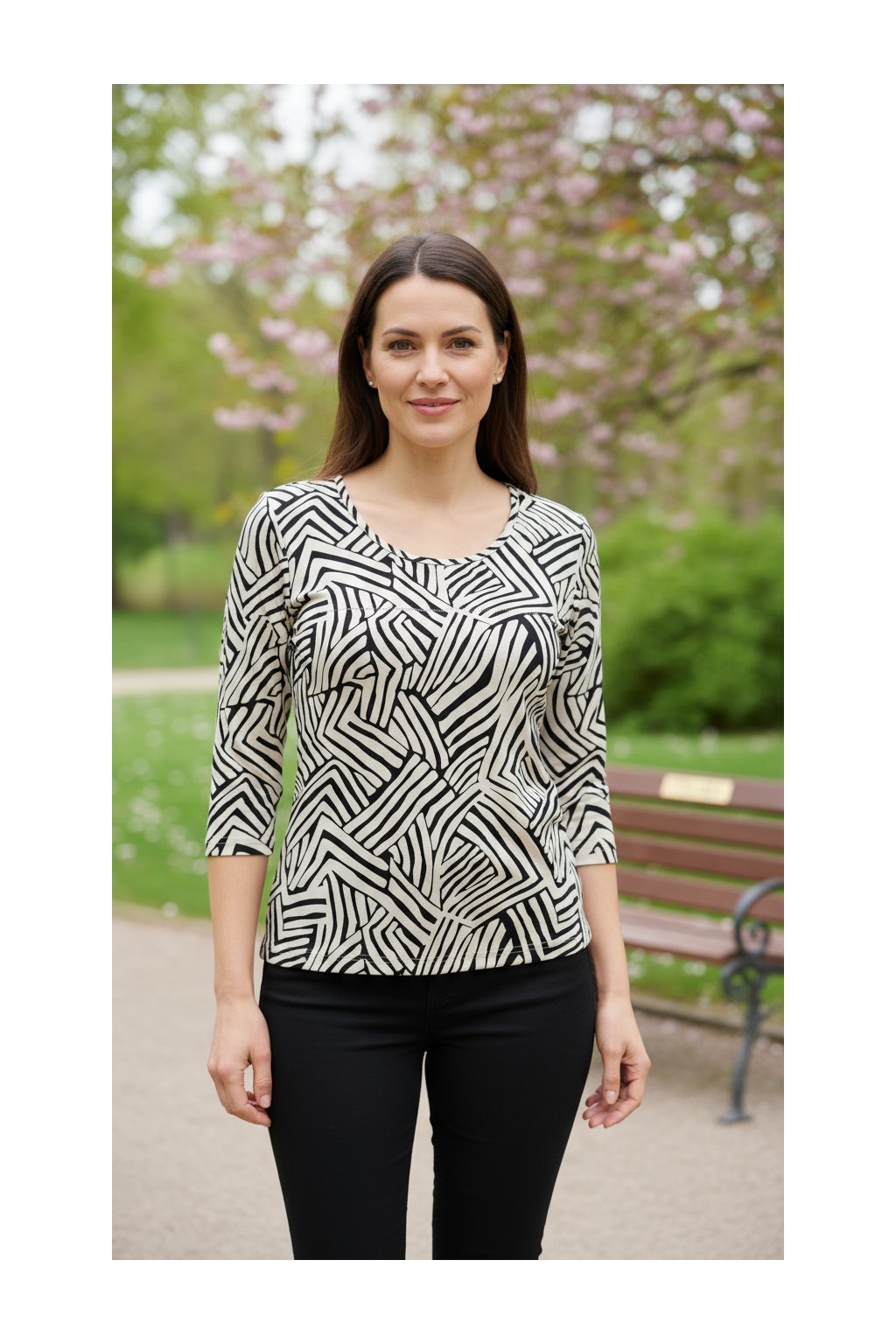 • Designové prvky: originální abstraktní potisk v módních barvách, kulatý výstřih a dekorativní kamínky v oblasti hrudi pro decentní lesk.