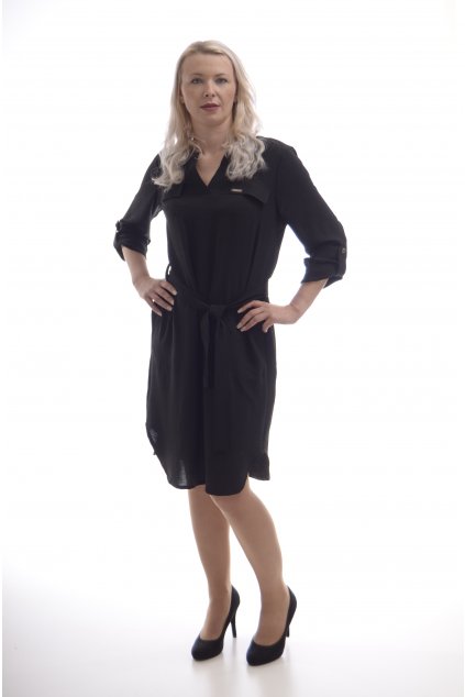 Šaty rovnějšího střihu v pase vypracované do gumičky. Průramky jsou raglánové. Výstřih předního dílu zdobí jemné sklady. Široký dvojitý lem výstřihu je na zadním díle zapínán na dva patentky. Délka oděvu : 96cm cm