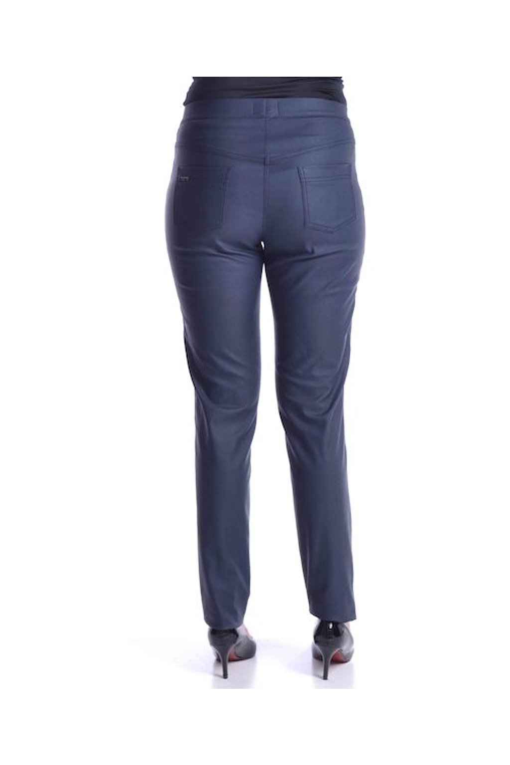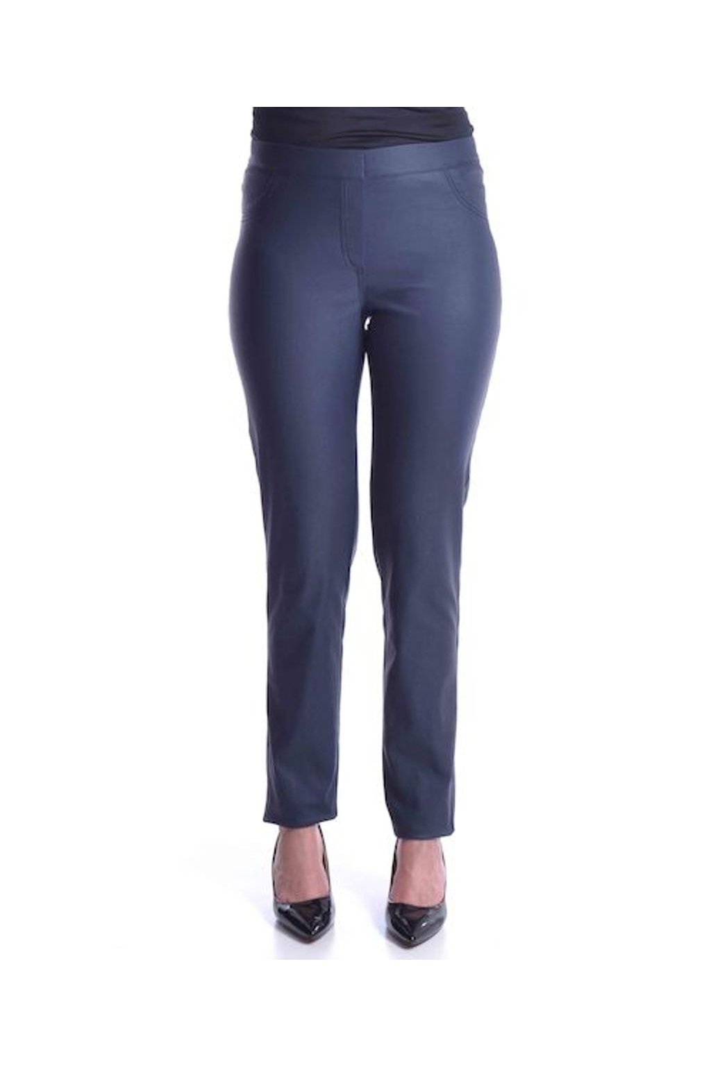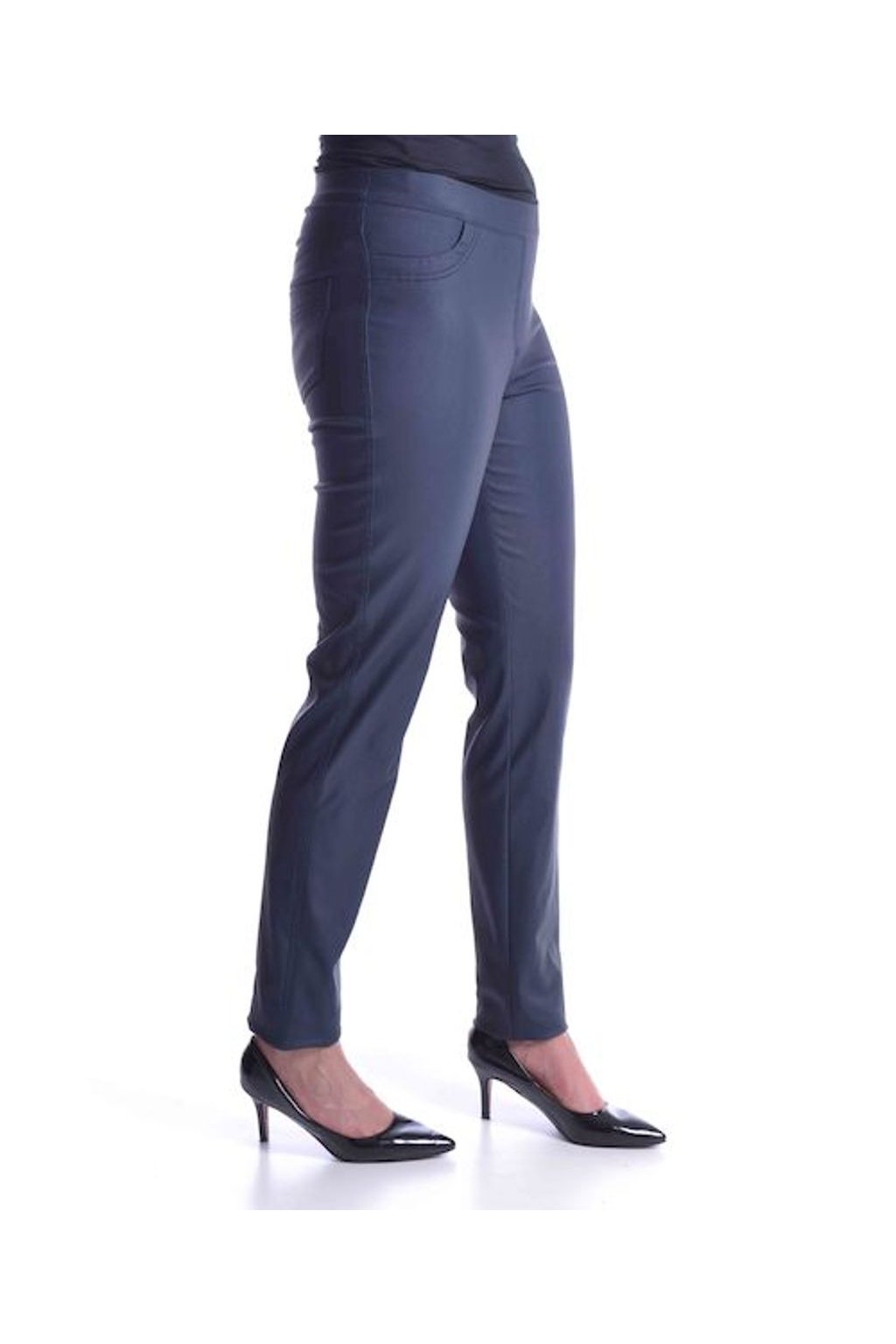 Kalhoty jsou přiléhavého střihu , zhotovené ze strečového materiálu koženého vzhledu. Přední díl je bez zipu s prošitím falešných kapes. Zadní díl zdobí dvě nakládané kapsy. V pase jsou vypracovány do pásku s gumou. Veškeré švy jsou ozdobně prošity 2x strojem.