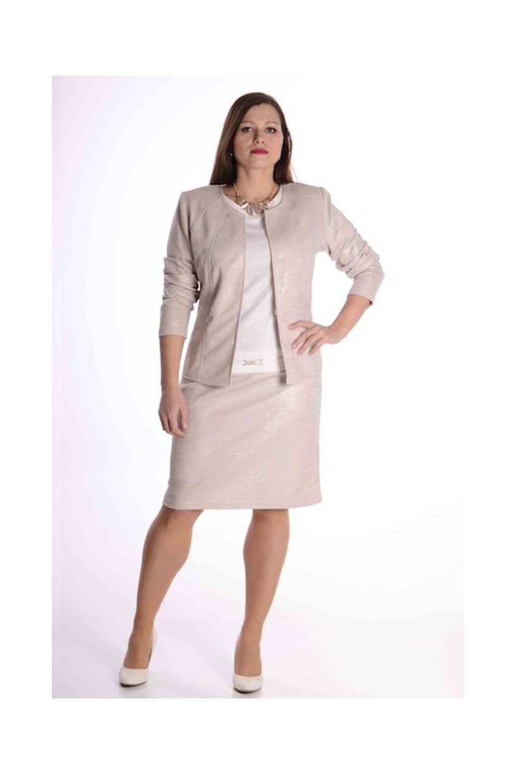 Pro tento kabátek jsme pro vás zvolili zcela nový materiál se zajímavou plastickou strukturou a stříbřitým efektem. Na předním a zadním díle je členěn několika švy, které mu dodávají perfektní přiléhavost na postavu. Rukávy jsou dlouhé. Kabátek je bez podšívky a je zapínán na předním díle na háček. Lze jej obléknout k šatům a vytvoříte tak oblečení, třeba pro malé společenské události.