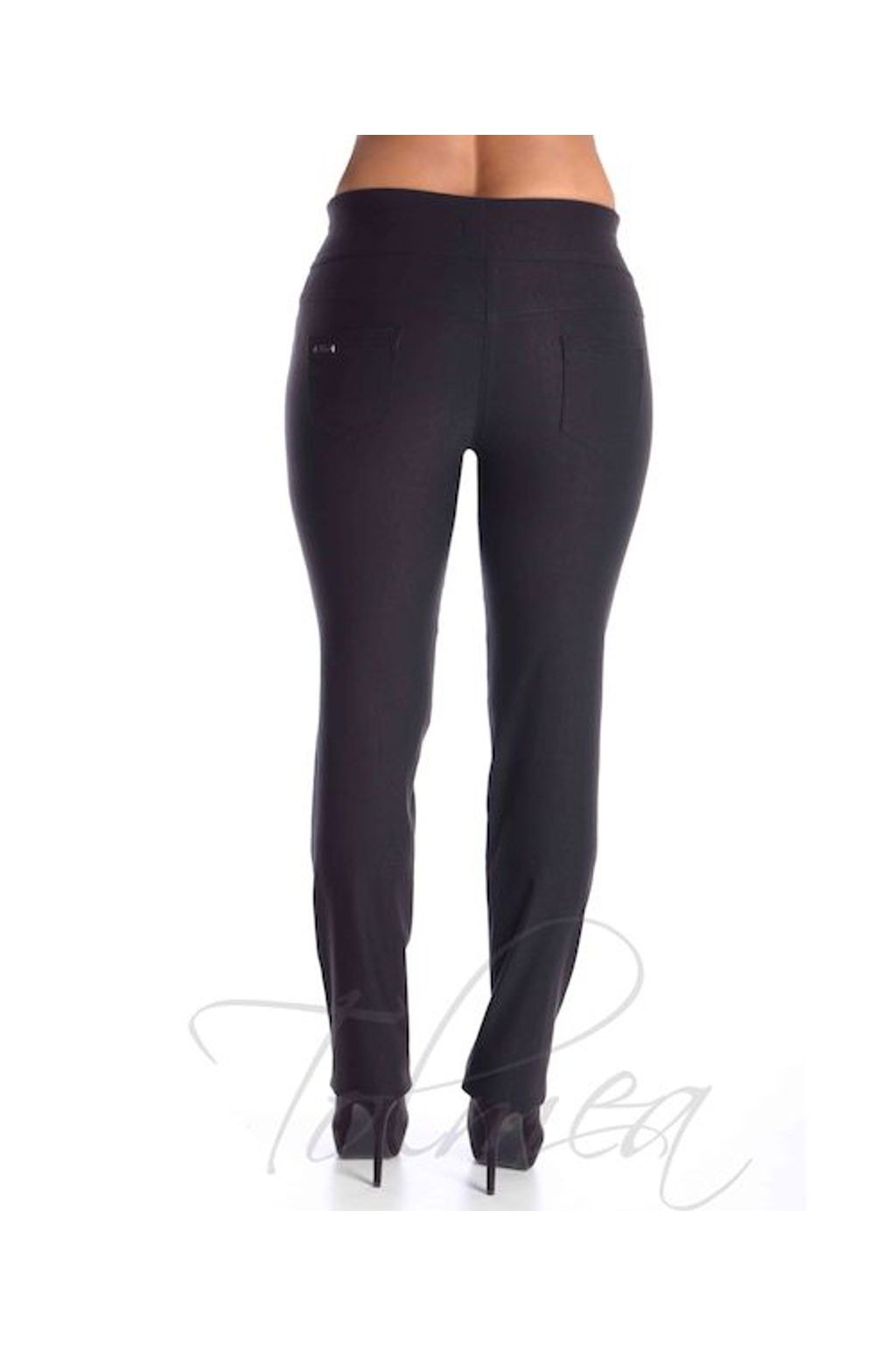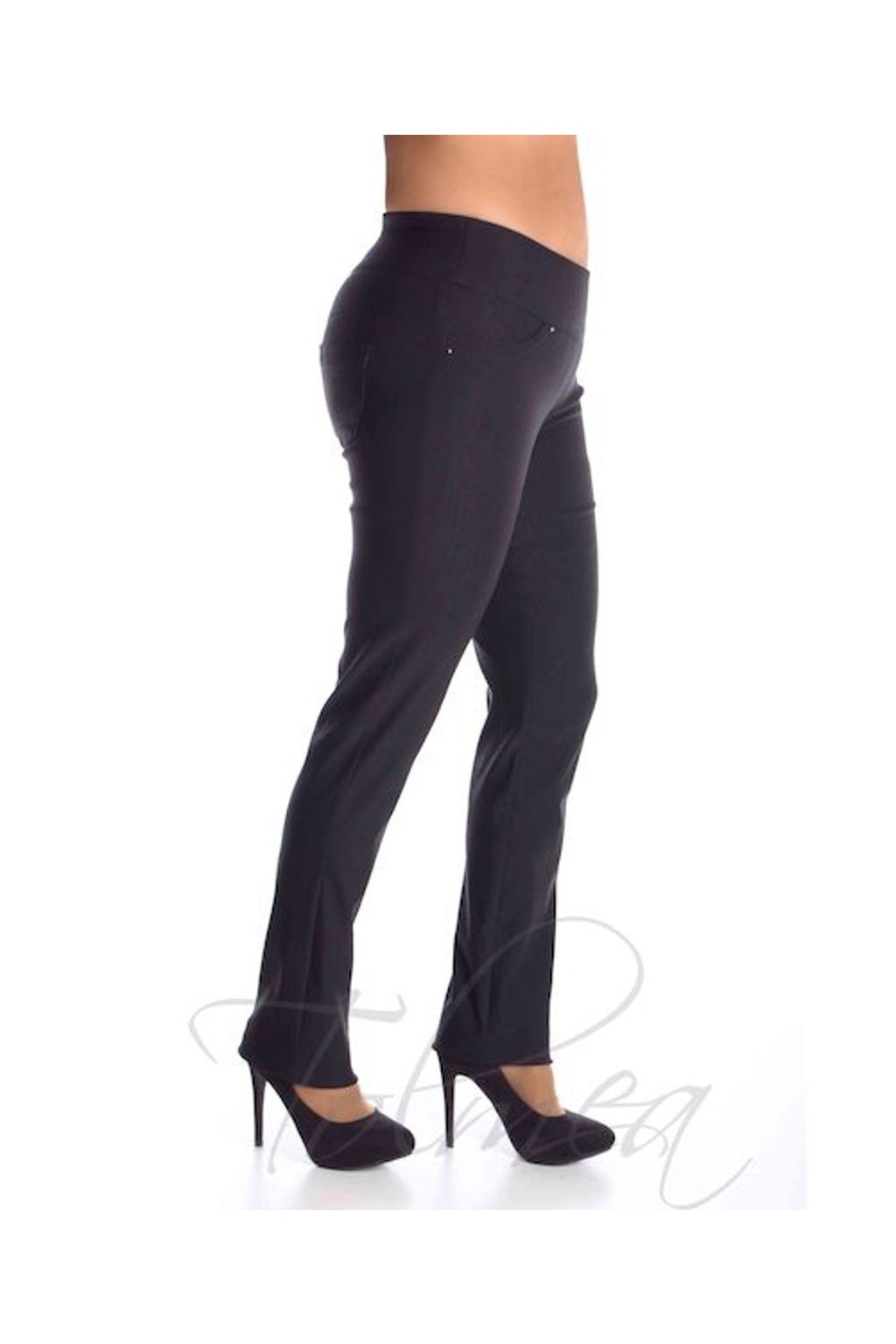 Kalhoty s vysokým pasem, střihově řešeny tak, že mají zeštíhlujicí efekt. Přední díl tvoří dvě falešné kapsy s nýtky. Zadní díl do sedla a dvě ozdobné nakládané kapsy s nýtky. V pase jsou zpracovány do gumy, což umožňuje jejich pohodlné nošení.