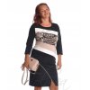 Šaty přiléhavého střihu s asymetrickým členěním předního dílu. Zde je vkusně využita kombinace několika materiálů, doplněna decentní kamínkovou aplikací. Spodní část sukně zdobí šikomo našitý funkční zip, kterým lze regulovat výši rozparku. Na šaty byl zvolen pevnější úpletový materiál, který je jako stvořený pro chladnější počasí.